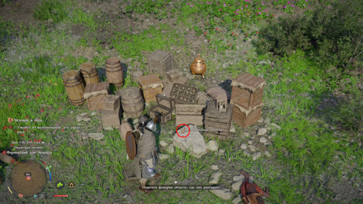 На месте вас ждёт группа бандитов. Разберитесь с тремя врагами, затем достаньте фонарь и найдите фрагменты памяти. Когда откроется воспоминание «Безрогая коза», откройте меню и выберите нижний значок на правой панели, чтобы посмотреть его. Если удобнее, можно зайти в инвентарь, использовать визионе и запустить воспоминание оттуда вручную.