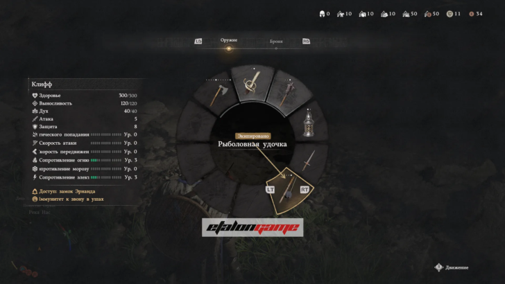 После покупки экипируйте удочку через вкладку «Оружие дальнего боя». Она занимает тот же слот, что и лук, поэтому перед рыбалкой важно убедиться, что в руках именно удочка.