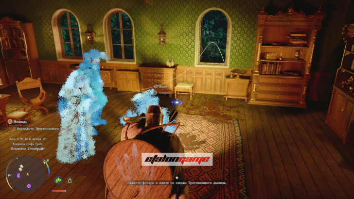После разговора со слугой на верхнем этаже осмотрите в той же комнате синее воспоминание и прочитайте через визионе память «Поместье Грейс». Это откроет следующий этап и позволит взять след Тростникового дьявола.