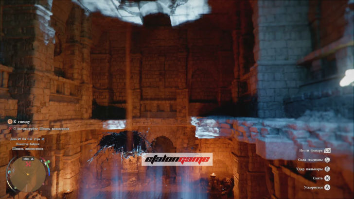 Большую сферу прямо перед собой не трогайте: она уже светит куда нужно. Идите вправо от неё и поднимайтесь по платформам к верхним сферам с лучами света. Для подъёма можно трижды применить «Удар пальмары» в воздухе.