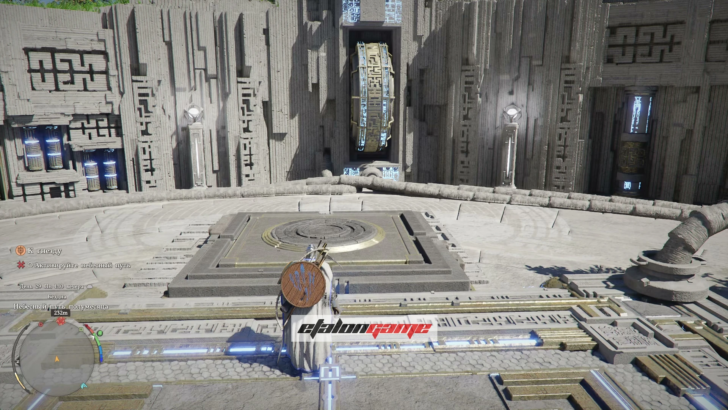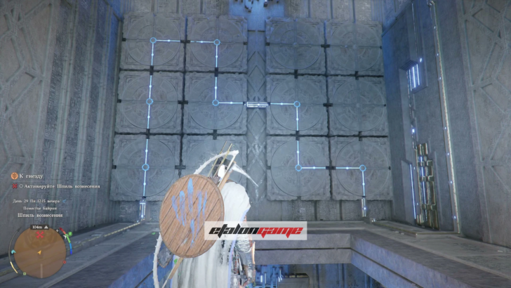 После этого центральная платформа поднимется на следующий этаж. Снова воспользуйтесь воздушным потоком, встаньте на платформу и найдите большую круглую настенную панель с синими символами. Поверните её два раза в любую сторону, чтобы силовые линии встали по схеме слева, снизу и справа.