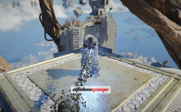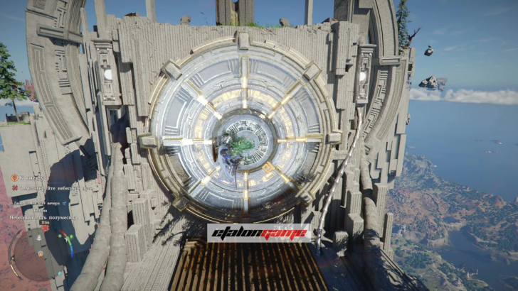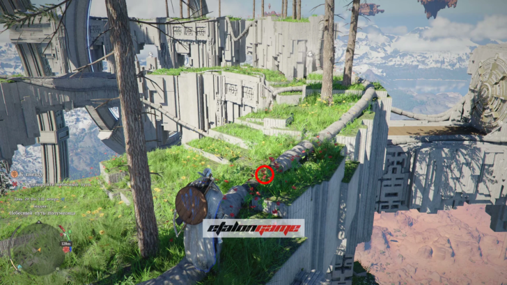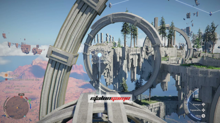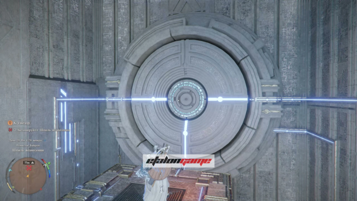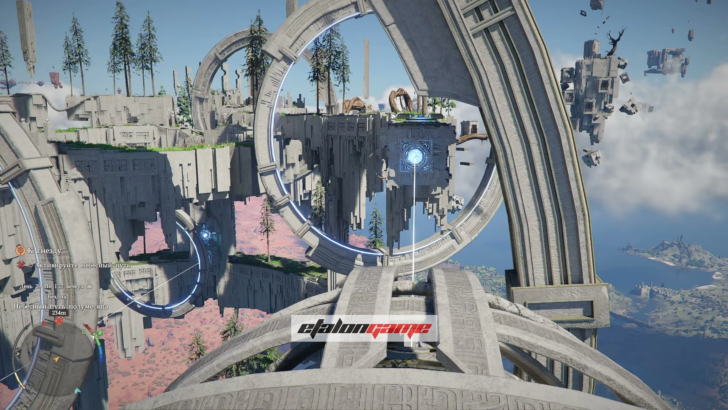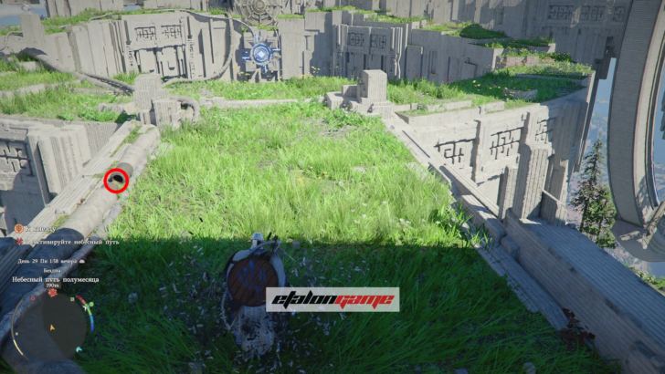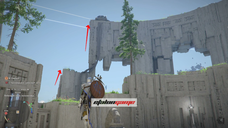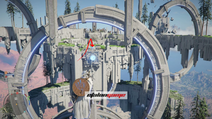 Поднимитесь по панели, идите к маркеру на мини-карте и пройдите через Небесный путь. Из земли появится столб: примените к нему навык «Сила Аксиомы» и поворачивайте влево или вправо, пока он не засветится синим. Когда свечение появится, остановитесь и подождите несколько секунд — после этого Небесный путь активируется.