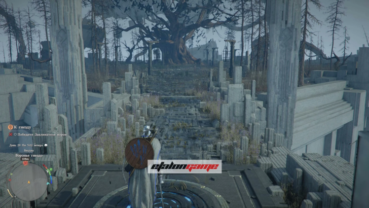 Там поднимайтесь по платформам, пока не увидите дерево. Перед тем как подходить к нему, активируйте Средоточие Бездны на круглой плите: это запасная точка возврата перед боссом. После этого идите к дереву. Запустится кат-сцена, затем на вас нападут враги. Победите их, и появится Заклинатель ворон.