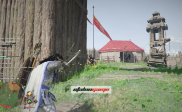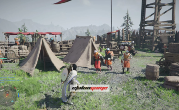 Идите к центральному лагерю, обнесённому палисадом. Вход открыт спереди, поэтому обходить укрепление не нужно: можно сразу зайти через главные ворота.