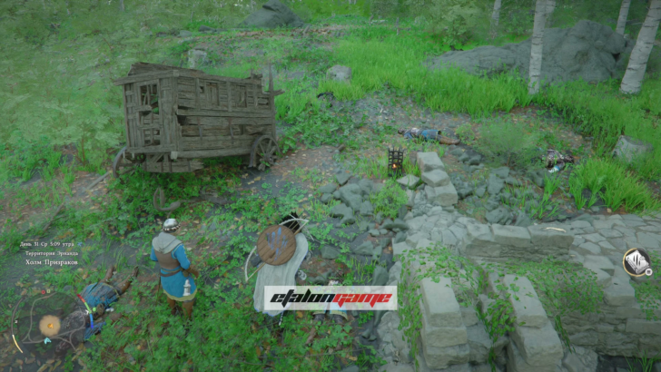 Это сюжетный дорожный квест: здесь нет головоломок и наград, но есть короткая засада после осмотра места нападения. Достаточно держаться рядом с проводником и не пытаться заранее искать отдельные интерактивные точки в лагере.
