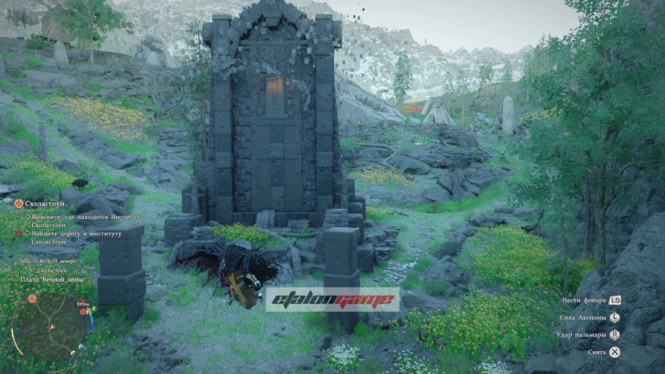 Оставшийся путь придётся пройти самостоятельно. Двигайтесь в сторону высокой башни на горе — это и есть нужное направление к институту.