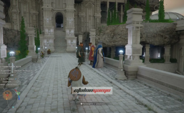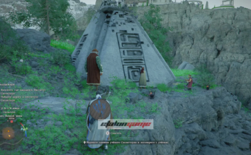 Теперь экипируйте униформу Схоластоуна из инвентаря. Рядом с местом прибытия стоит человек у каменной пирамиды. Подойдите к нему в форме учёного Схоластоуна и поговорите. После этого он начнёт проводить вас дальше, так что просто следуйте за ним, пока он не остановится у скал.