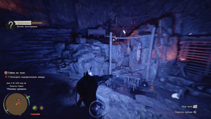 Идите вперёд и разберитесь с врагами у входа в пещеру. Когда путь будет свободен, спускайтесь вглубь до самого конца. Достаньте фонарь и осмотрите синие следы, чтобы открыть воспоминание о логове похитителей зверей.