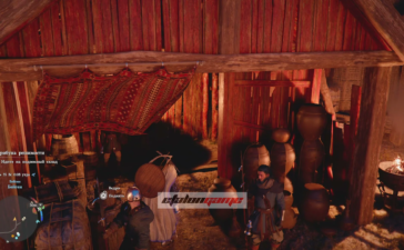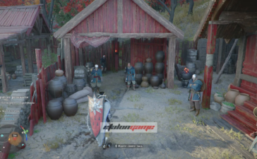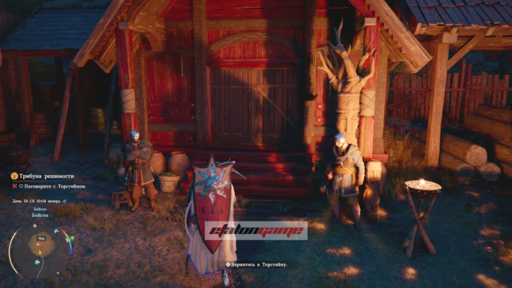 Затем выйдите во двор и подойдите к Торстейну, где его уже ждут бойцы. Запустится следующая сцена с речью Торстейна перед Синими Клыками.
