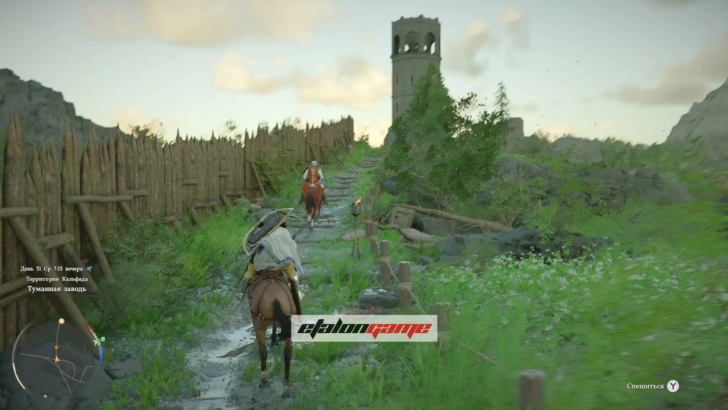 Дальше нужно ехать вместе с ним верхом к холму. Путь долгий, но дополнительных действий по дороге нет: просто держитесь маршрута сопровождения, пока солдат не доведёт вас до сигнальной башни.