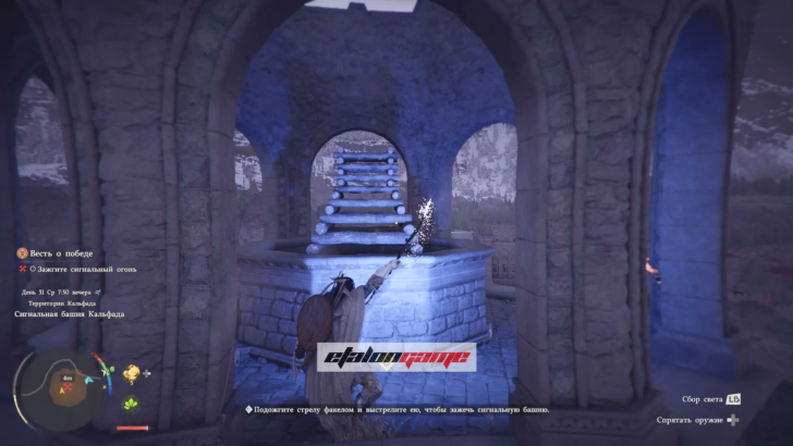 Наверху нужно разжечь огонь в жаровне. Подцель может формулироваться как «Подожгите стрелу факелом и выстрелите ею, чтобы зажечь сигнальную башню», но это не единственный способ.