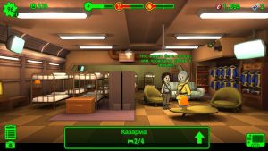 Внутренности Убежища – здесь располагаются все Ваши постройки так, как Вы хотите. Помните, что нужно оставлять немного места, чтобы улучшать постройки и нужно распределять обитателей с определёнными характеристиками в правильные комнаты. Когда в комнате заканчивается производство чего-то, появится значок — щёлкните на него, чтобы собрать ресурсы. Нажимая на комнату Вы можете также проверить, сколько времени остаётся до завершения производства, или использовать опцию «Ускорение».