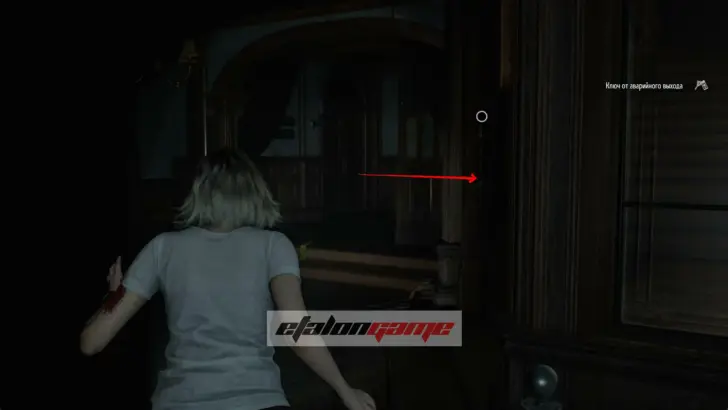 Получив ключ, вы автоматически подберёте кочергу. Дальше эпизод почти полностью линейный: активно нажимайте кнопку, а когда снова получите управление после удара, бегите обратно на второй этаж. Там взаимодействуйте с дверью справа, используйте и завершите этот отрезок.